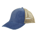 Adams Ollie Distressed Visor Cap. 100% cotton front panel and distressed torn visor. 100% nylon mesh back panels. Cotton twill sweatband with matching color plastic snap back closure. Pigment dye front panels. 6 panel, mid-crown structured cap.