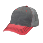 Adams Endeavor Cap. Five panel unstructured low crown cap. 100% cotton twill pigment dyed and garment washed. Nylon mesh back. Grey plastic snap back. Raised contrast stitching on top visor that matches front panels. Light grey twill undervisor matches seam tape.